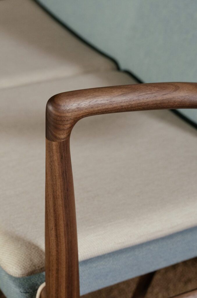 この分離構造により、座面がフレームからまるで宙に浮いているかのように見えます。重厚になりがちな木製ソファに、驚くほどの軽やかさとモダンな印象をもたらしました。