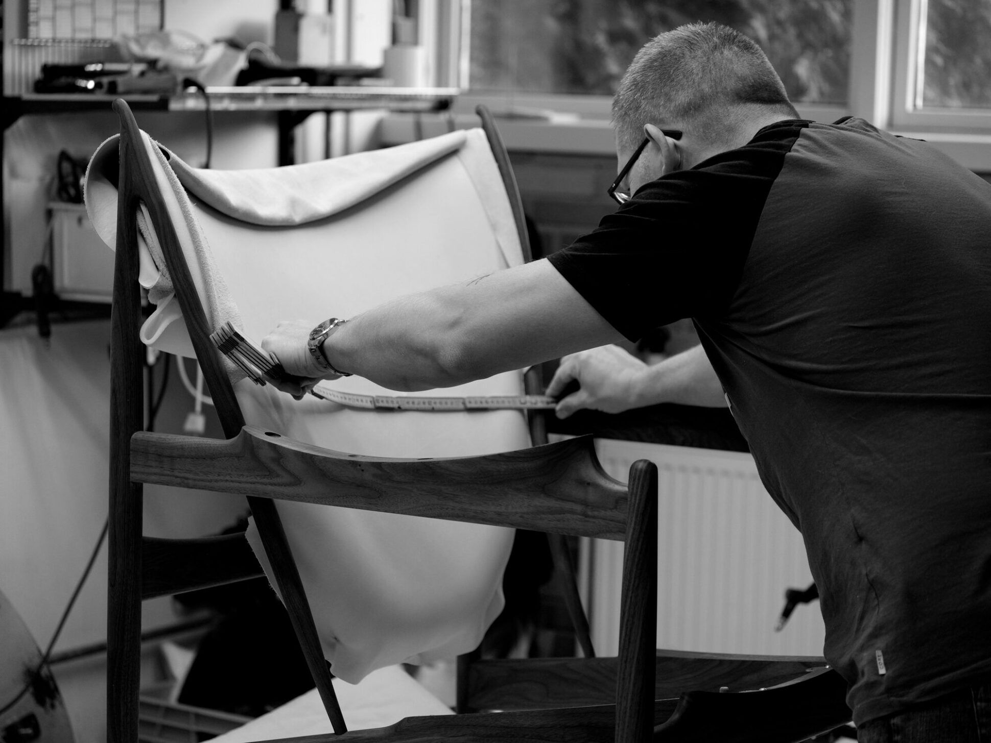 現代のテクノロジーの恩恵を受けながらも、フィン・ユールの家具に宿る独自のディテールや美しさは、あくまで熟練の職人による丁寧な手仕事によってこそ実現されています。特に、精巧な木枠の構造は非常に高度な木工技術を要し、その精度を形にできる職人は世界でも限られており、日本の卓越した技術をもつ職人たちと、創業当初からパートナーシップを結び、共にものづくりを行っています。日本とデンマークは、どちらも素材への敬意、シンプルで実用的な美学、そして手仕事を重んじる文化を持つ国で、共通する哲学と価値観があります。