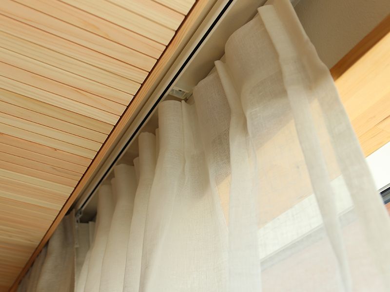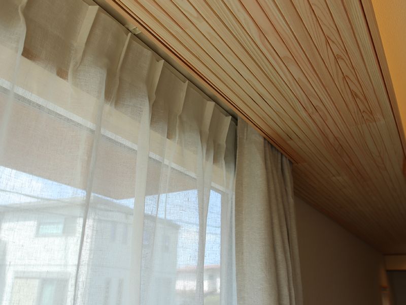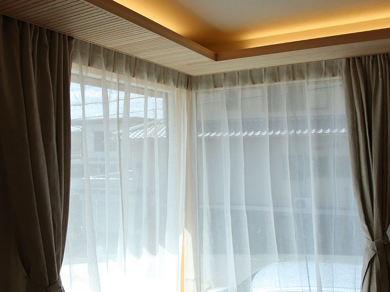今回の事例では、家づくりにおいて、カーテンを設置することをあらかじめ計画し、設計段階で「天井カーテンボックス」を施工しています。
