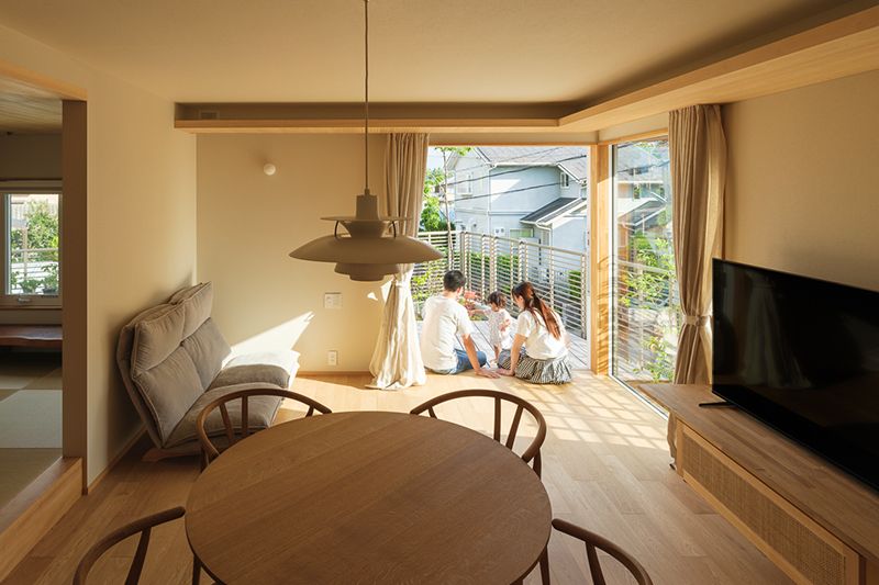 床や天井・建具に使われた木の温かみと、ざっくりとしたリネンレースカーテンの質感が、明るく気持ちの良い開放的な空間をもたらしています。