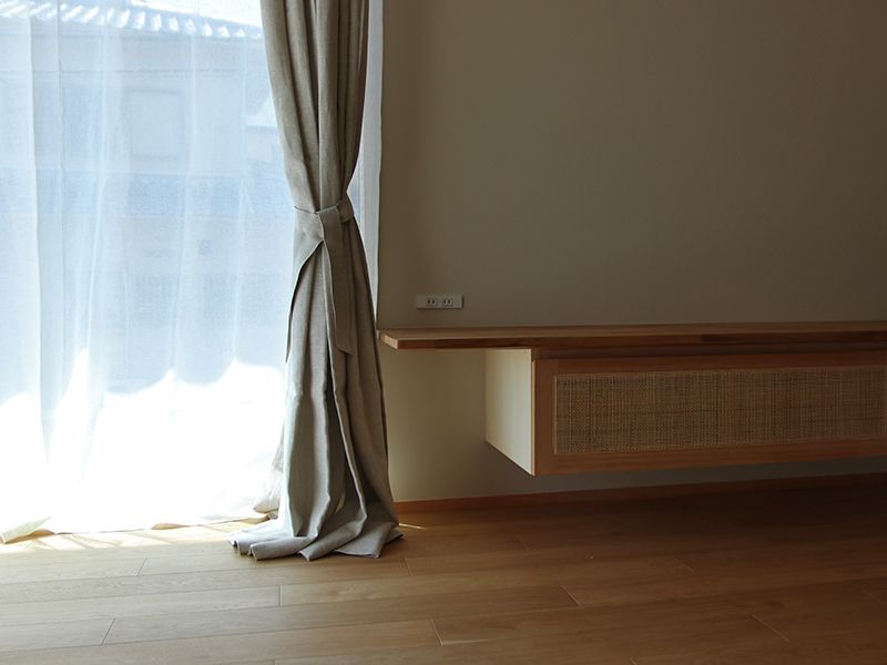 今回の事例で、K様が特にこだわられたのがカーテンの「丈(たけ)」です。日本の一般的なカーテンは、床に擦れない高さ、床から1〜2cm浮かせて製作することが多いですが、今回のリネンカーテンはあえて床にたわむほどの「長めの丈」で製作しました。