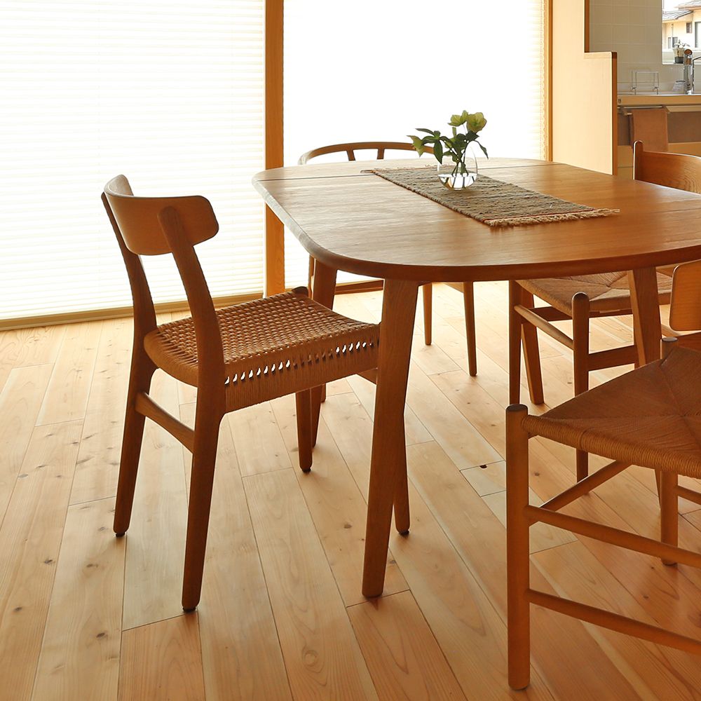 ダイニングテーブルは、カール・ハンセン&サンの伸長式テーブル「CH002」。オーク材の温かみのある天板を囲むように、あえてデザインの異なる4脚をセレクトしました。