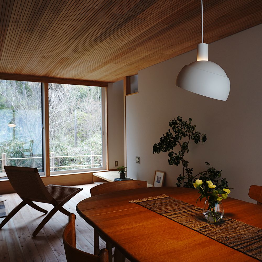 ダイニングを照らすペンダントライトには、フィン・ユールによる「FJエレメント」を選びました。彫刻的なフォルムから放たれる光は、木の天井に美しい陰影を映し出します。あえて少し低い位置に吊るすことで、家族が囲む食卓をより親密で、特別な場所へと変えてくれます。