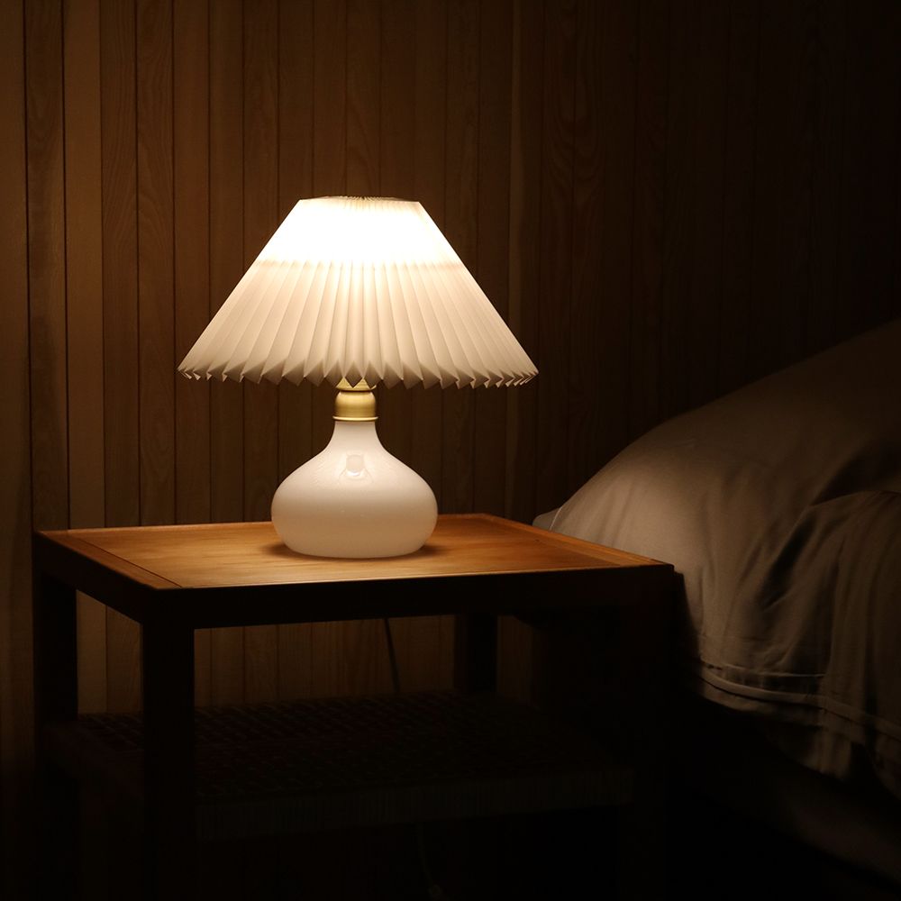 1996年、「アンドレアス・ハンセン」にデザインされた小ぶりなテーブルランプ。丸みのある愛らしいオパールホワイトの手吹きガラスベースと、手折りの“Model 2”シェード(側長17cm)の組合せが端正です。