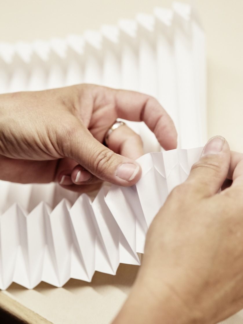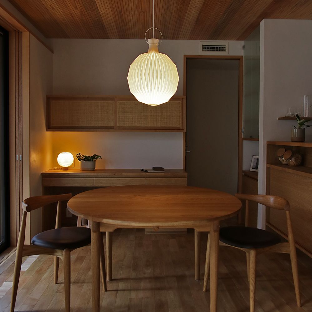 紙シェードは温かい陰影を、難燃性PE樹脂は白さとメンテナンスしやすい素材で、どちらの素材も耐久性や意匠性の基準を満たすよう選定され、職人が時間をかけて一枚ずつ折り上げています。プリーツによって拡散する光は、まぶしさを抑えつつ、壁面に穏やかなグラデーションを生み出します。