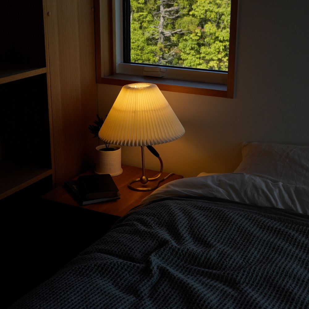 オークのサイドテーブルに314をのせ、ナチュラル素材のベッドメイク。昼は素材の濃淡、夜はプリーツの陰影が壁に溶け、空間の呼吸が整います。