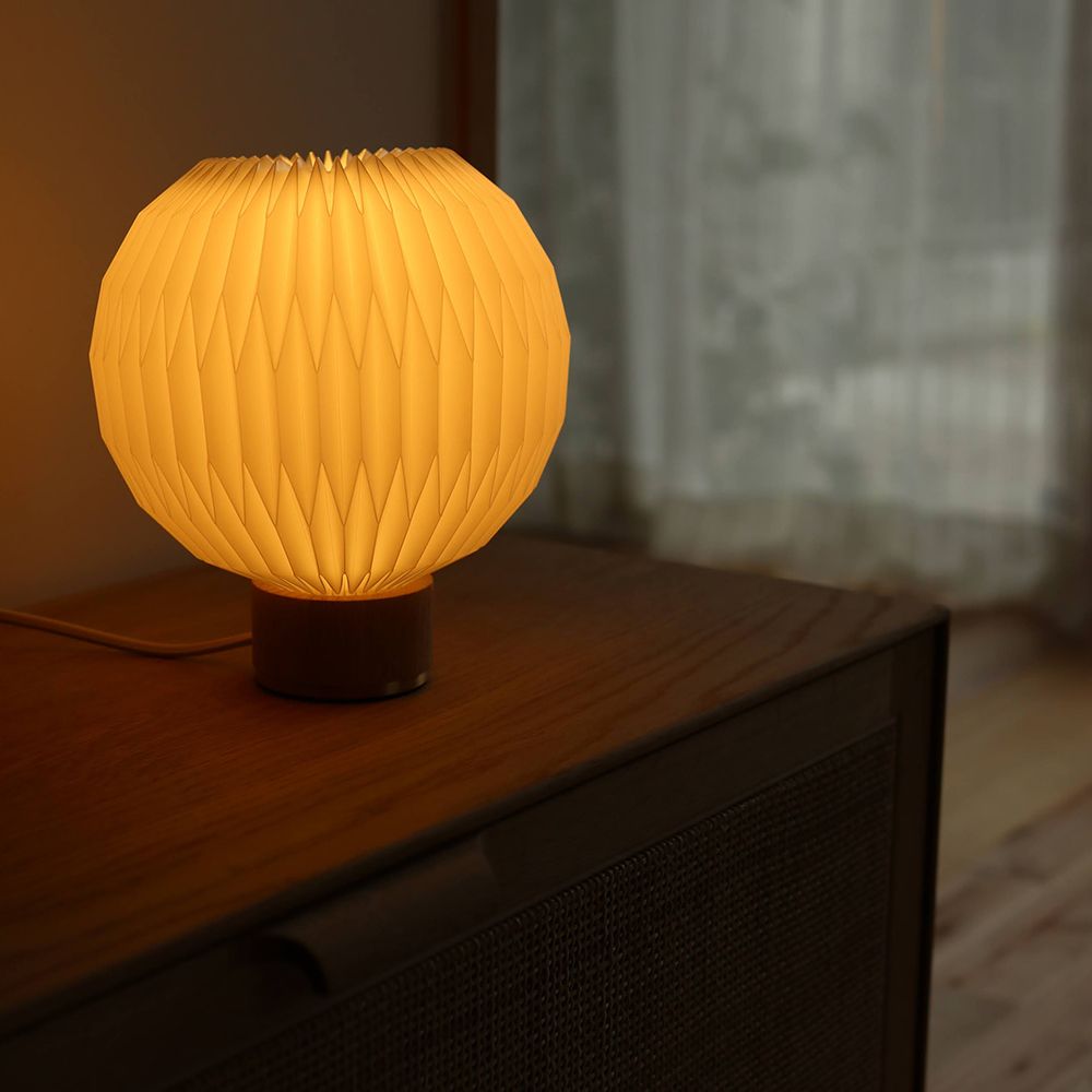 1942年のペンダント“Model 107(エスベン・クリント)”をテーブルランプへ落とし込んだ記念モデル。創業75周年の2018年に登場し、ライトオーク/スモークドオークの台座と真鍮ディテールが、プリーツの陰影を際立たせます。サイズは、XS・S・Mの3種で、たとえばXS:H25ר22cm/E14、M:H38ר33cm/E27と、用途に合わせやすい構成です(LED最大20W表記)。和空間にもよく馴染み、素材感のあるファブリックや土ものの花器と合わせると、静かな“灯りの中心”が生まれます。