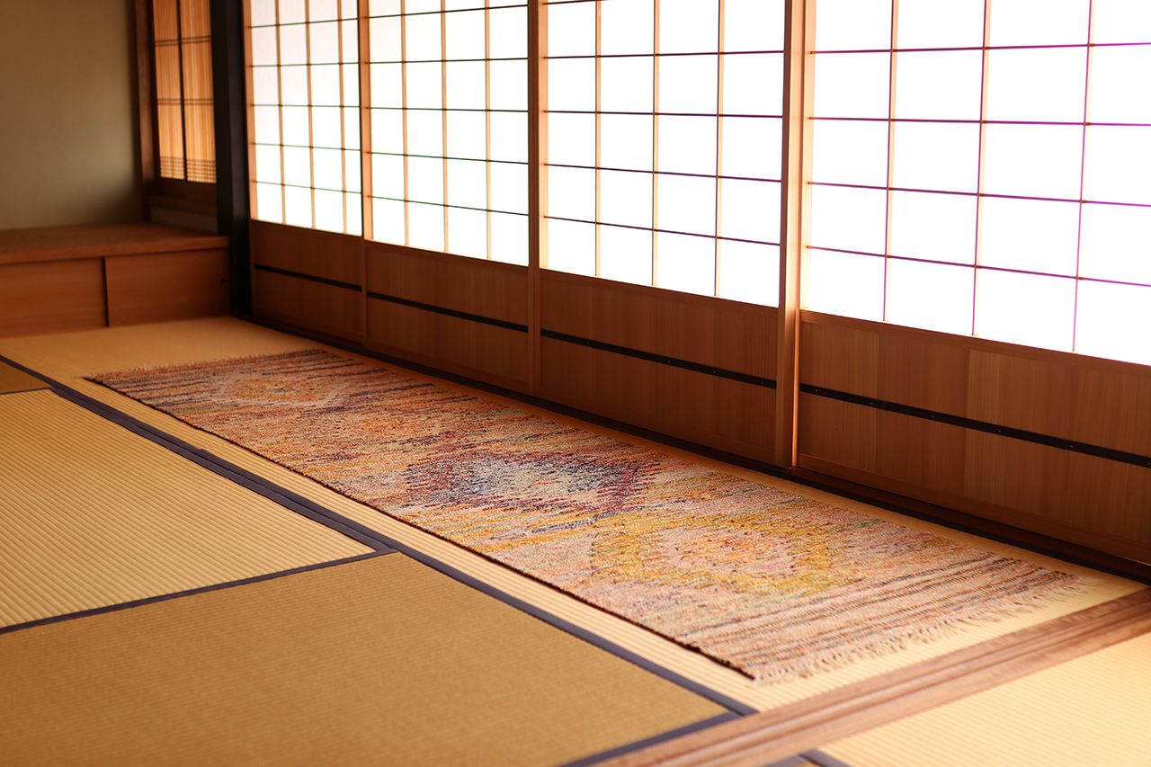 また、ロゴバキリムは毛足のない「平織り」なので、通気性が抜群。厚ぼったくならず、畳の段差もさほど気になりません。 冬は足元の冷えを防ぎ、夏はさらりと快適。 機能面から見ても、「畳×キリム」は理にかなった最高の組み合わせなのではないでしょうか。