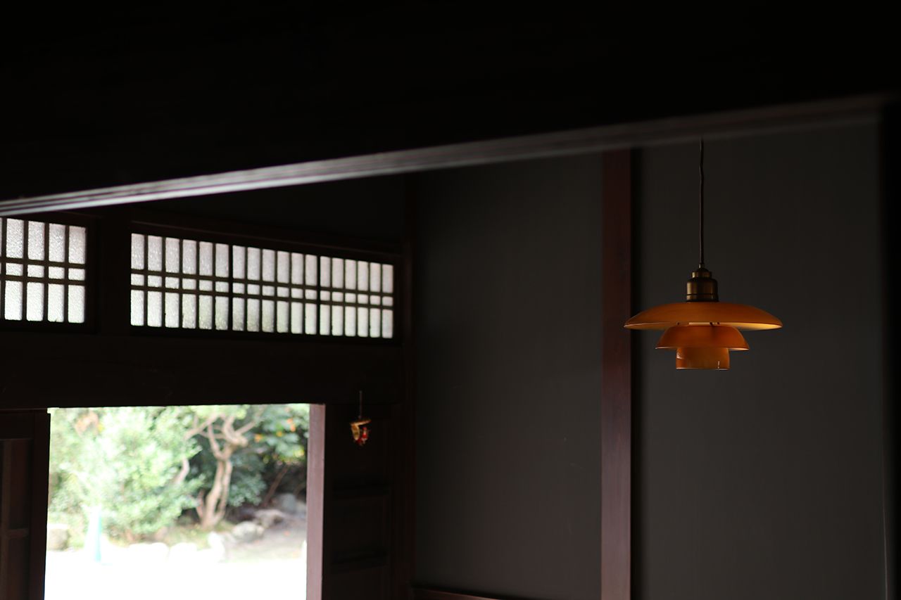 格子戸の向こう、薄暗い空間にポッと灯る温かなオレンジ色の光。 ここでは、北欧照明の代名詞とも言えるルイスポールセンの「PH 3½-3 琥珀色ペンダント」をコーディネートしました。(※琥珀色は期間限定販売品のため現行品ではございません。)