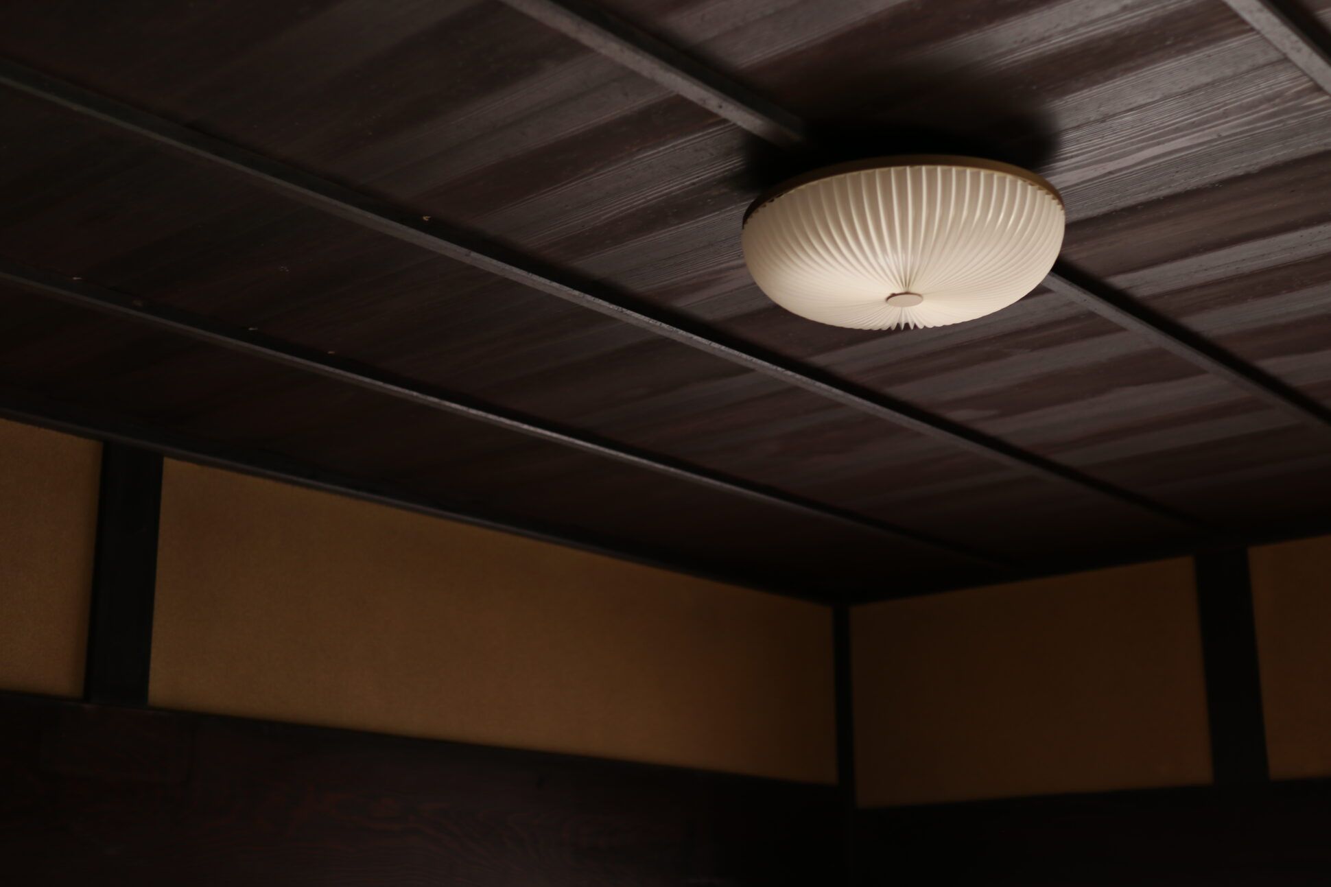 そして、玄関土間より上がった空間の黒く煤(すす)けたような味わい深い天井板に、ふわりと浮かぶ白い明かり。 これはLE KLINT(レ・クリント)のシーリングライト「LAMELLA(ラメラ)」です。