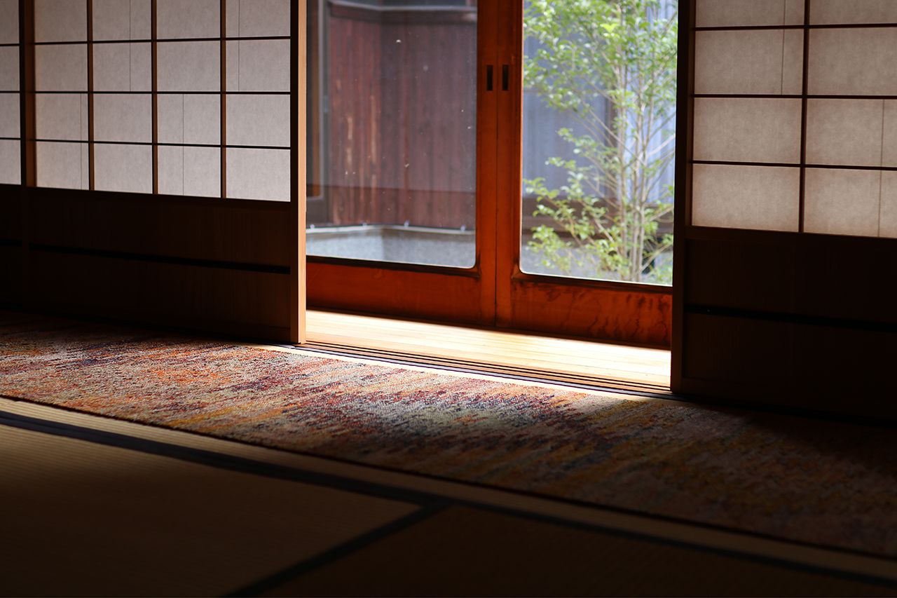 照明と同じくらい、空間の印象を決定づけるのが「床」のしつらえです。 写真の右側、畳の上に敷かれた長いラグにご注目ください。