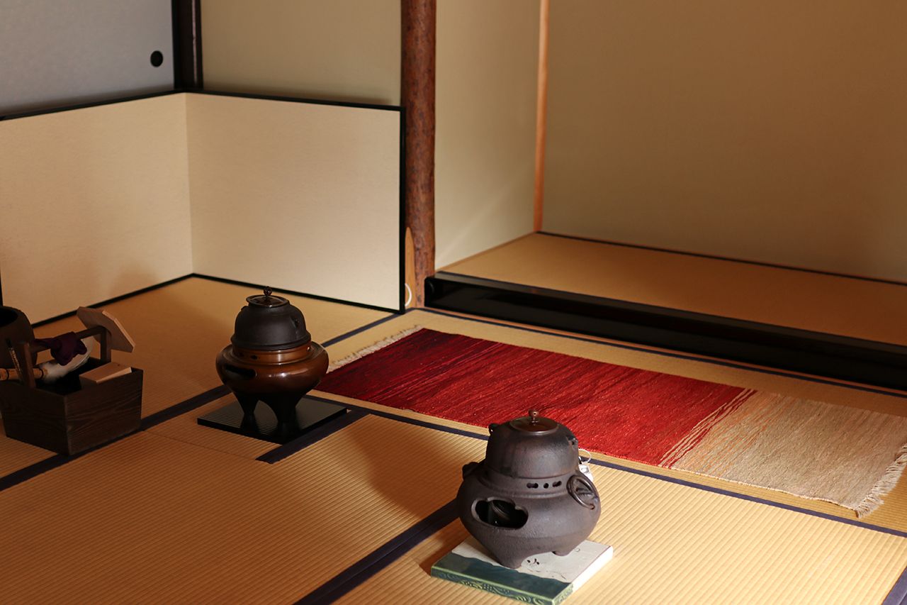 畳の縁(へり)に沿って、長く敷かれたキリム。 これがお客様を点前座へと導く「道」となり、同時に空間を緩やかに仕切る「結界」の役割を果たしています。