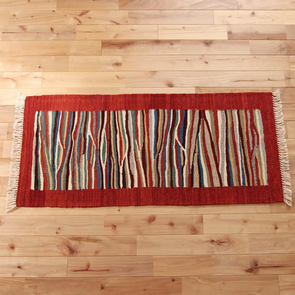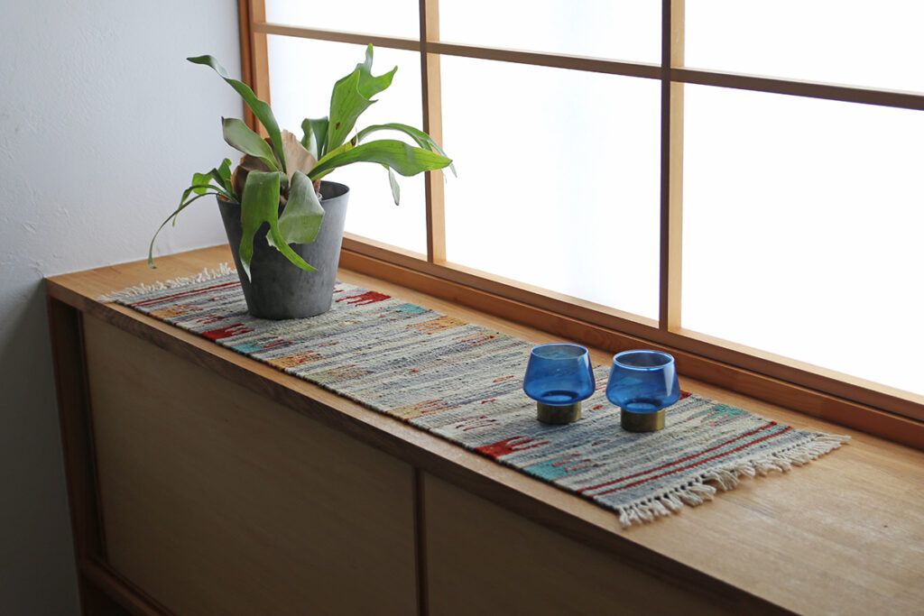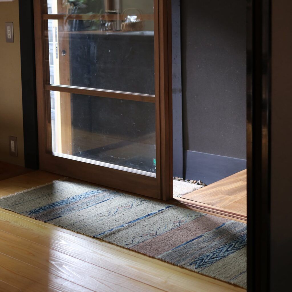 建具や床より少し暗めにすると、キリムの色彩がくっきり際立ちます。周囲が暗めの場合は、明るいものをお選びいただくこともあります。 - 日頃のお手入れは、粘着テープと掃除機で