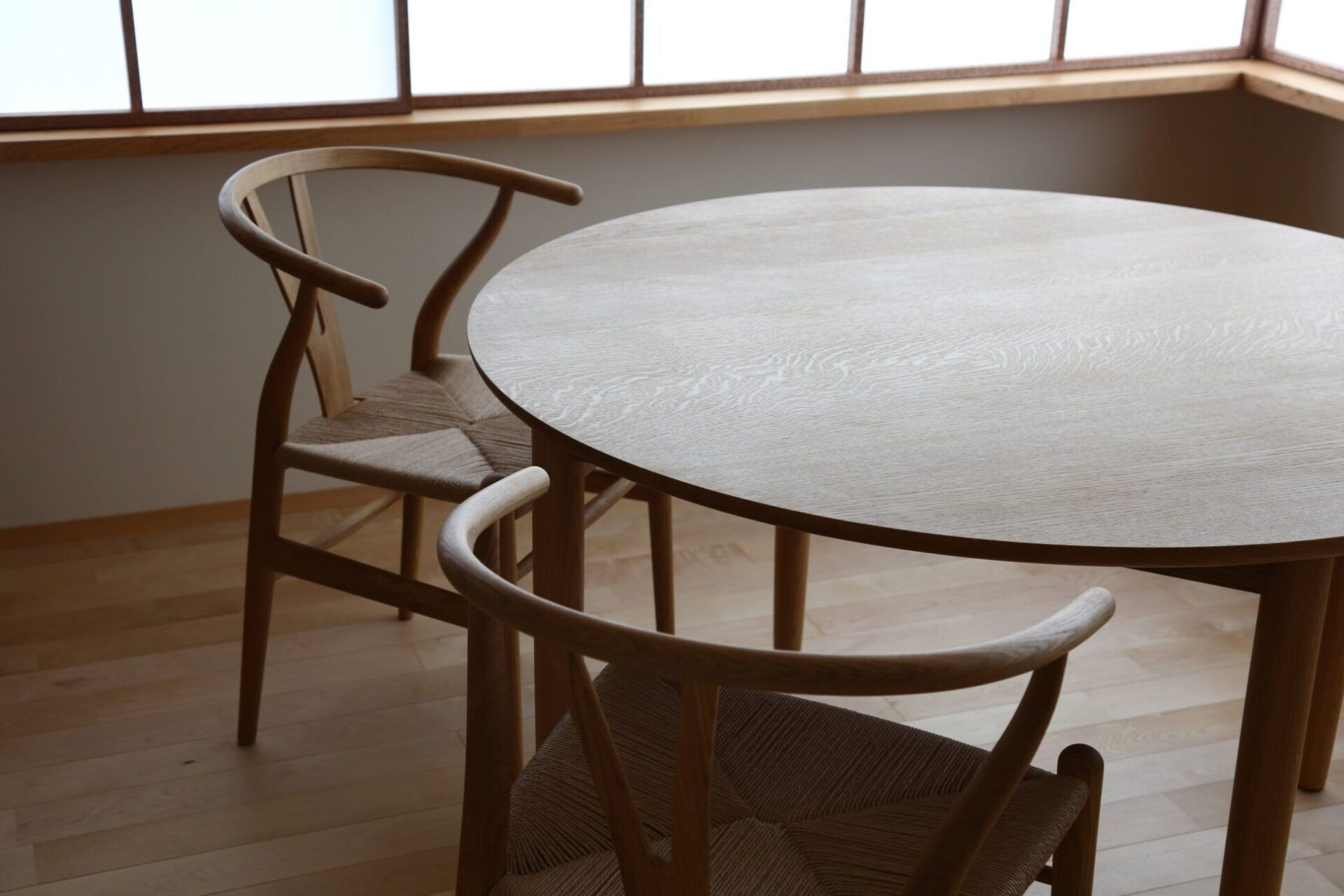 また、家の中は構造的にも直線で構成されているため、丸いテーブルを置くと、空間全体に柔らかく穏やかな印象が生まれます。